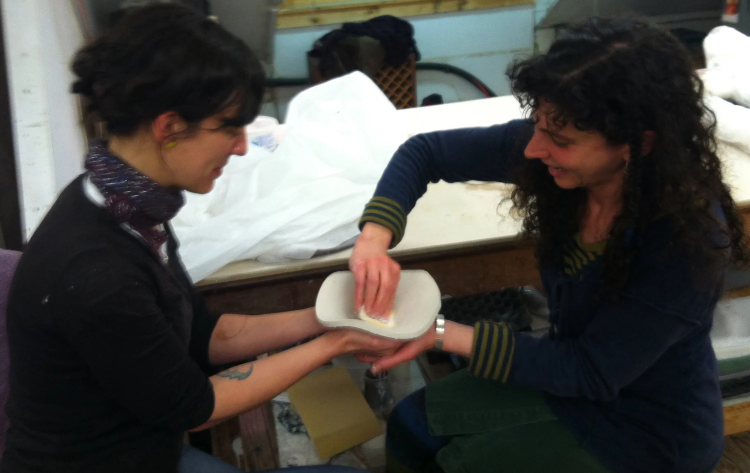 The heart of pottery’s conceptual content resides in the space that an object fills in our lives; the pot is a positive that fills the negative formed by the gesture of a body. When first designing forms for one person to feed another person, I decided to use actual hands as a slump mold for the gesture of offering. It is significant that hands may be open and receptive during both actions of giving and of receiving.
